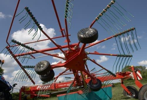 - Alla hjul är placerade nära räfsarmarna för bästa markföljsamhet och arbetsresultat.